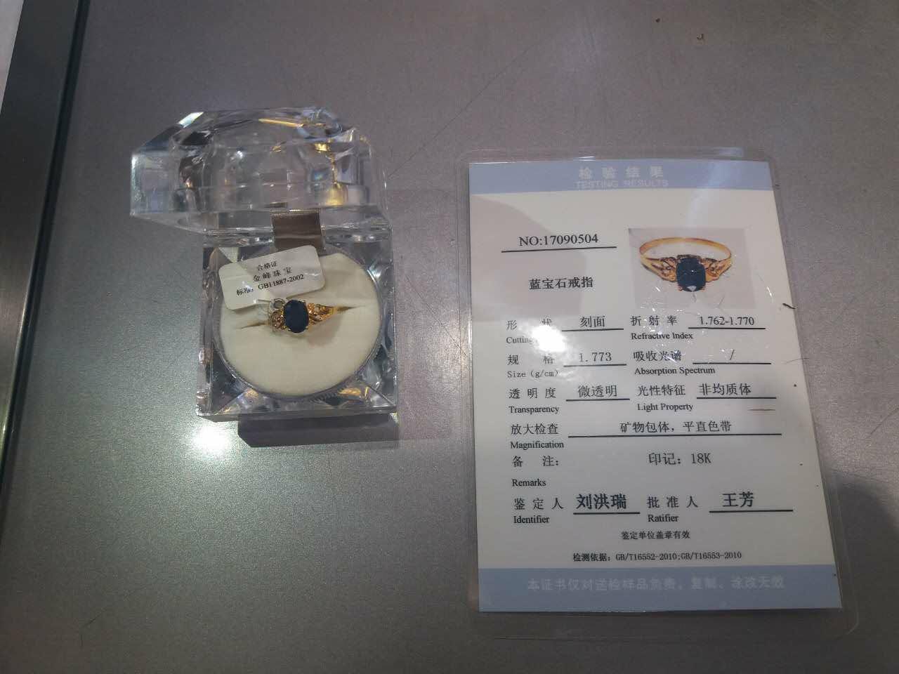 4、藍(lán)寶石戒指一枚,18K黃金鑲嵌,規(guī)格1.773g/cm。有省地礦出具檢驗(yàn)報告。參考價500元。