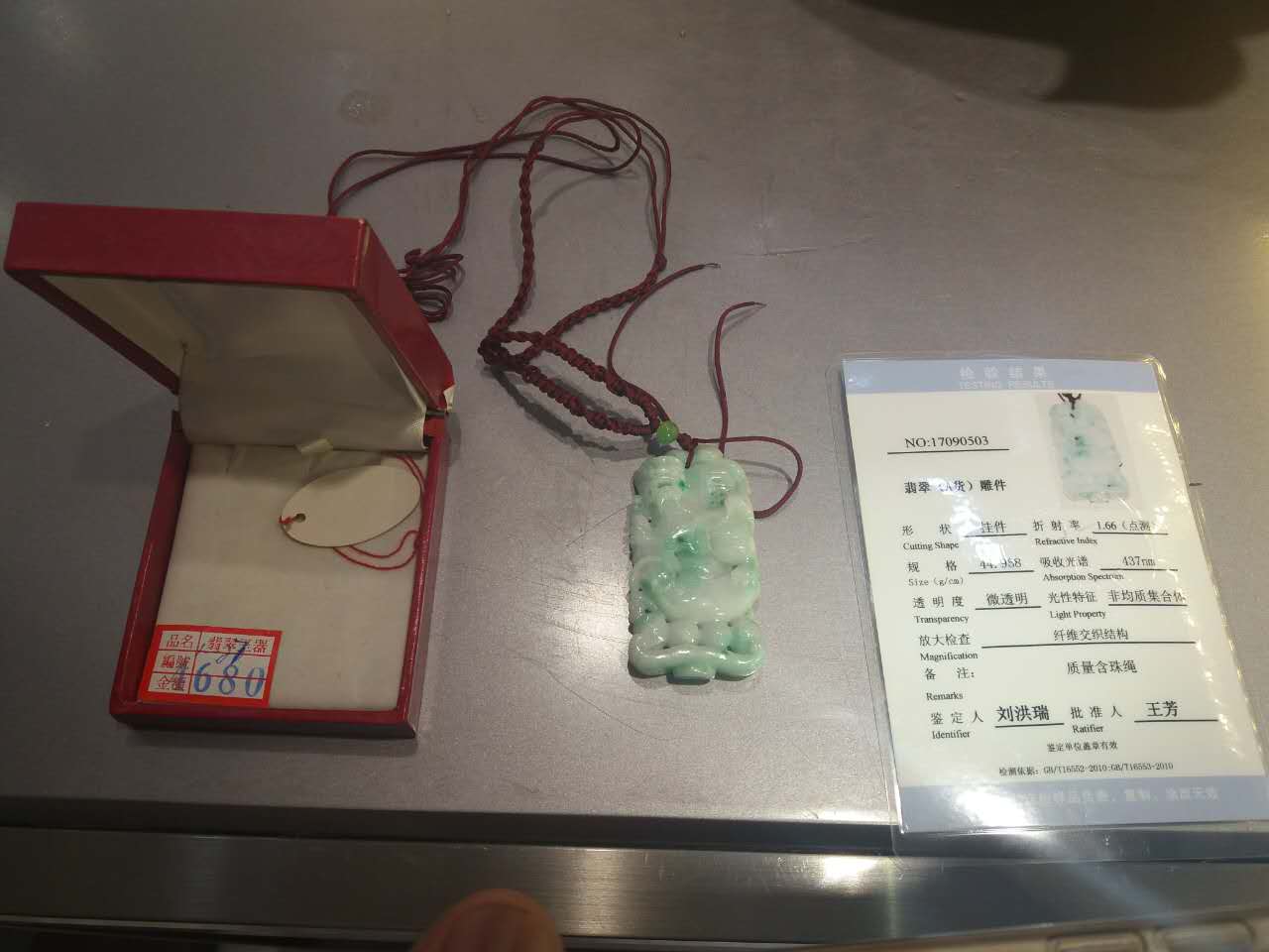 3、翡翠A貨掛件一件,規(guī)格44.968g/cm,有省地礦出具的檢驗(yàn)報告。參考價1500元。