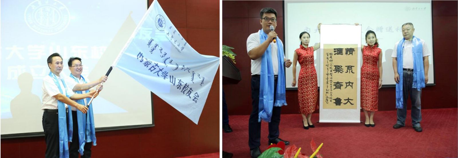 上午10點,大會在內蒙古大學校歌中正式拉開帷幕。校友們集體觀看內蒙古大學紀錄片;內大90級歷史系校友、內大山東校友會籌委會主任鄧剛作籌備工作報告;大會表決通過了內蒙古大學山東校友會章程;公布了內大山東校友會首屆理事會名單和校友會首任會長、副會長、秘書長、副秘書長的名單;內大副校長、內大校友總會會長鐵勇為山東校友會授旗,林擘會長代表內大山東校友會接受會旗;內大呼和浩特校友會會長、內大文學與新聞傳播學院原黨總支書記王俊川代表兄弟校友會致辭;煙威校友會向山東校友會送上“情系內大、匯聚齊魯”的書法作品;96級文史哲基地班校友王莉代表山東校友發言;內大山東校友會首任會長林擘致辭,并帶領全體到會校友領讀內蒙古大學山東校友會成立宣言;內蒙古大學副校長、內蒙古大學校友總會會長鐵勇代表學校發表重要講話,對山東校友會提出殷切希望。最后,鐵勇副校長等校領導、嘉賓和與會所有人員進行了集體合影,內蒙古大學山東校友會成立大會在一片溫馨和諧的氣氛中結束。