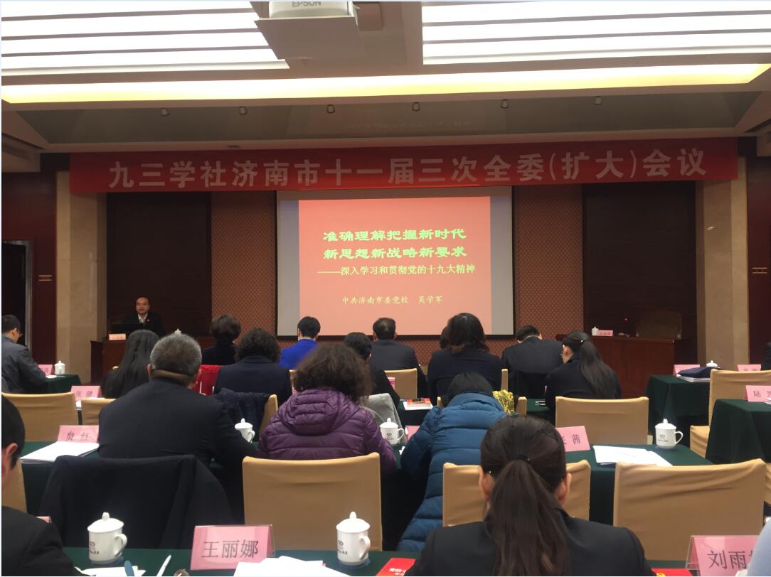 同時,會議邀請中共濟南市委黨校教授吳學軍作了題為《準確理解把握新時代新思想新戰略新要求——深入學習和貫徹黨的十九大精神》的主題報告,從十九大召開的時代背景和我國發展新的歷史方位、習近平新時代中國特色社會主義思想與基本方略、新時代中國特色社會主義發展的戰略安排和部署、全面從嚴治黨不斷提高黨的執政能力和領導水平等四個方面,對十九大精神進行了深入的解讀,對社員們準確把握、深刻領會中共十九大精神的豐富內涵、精神實質、核心要義起到了很好的促進作用。