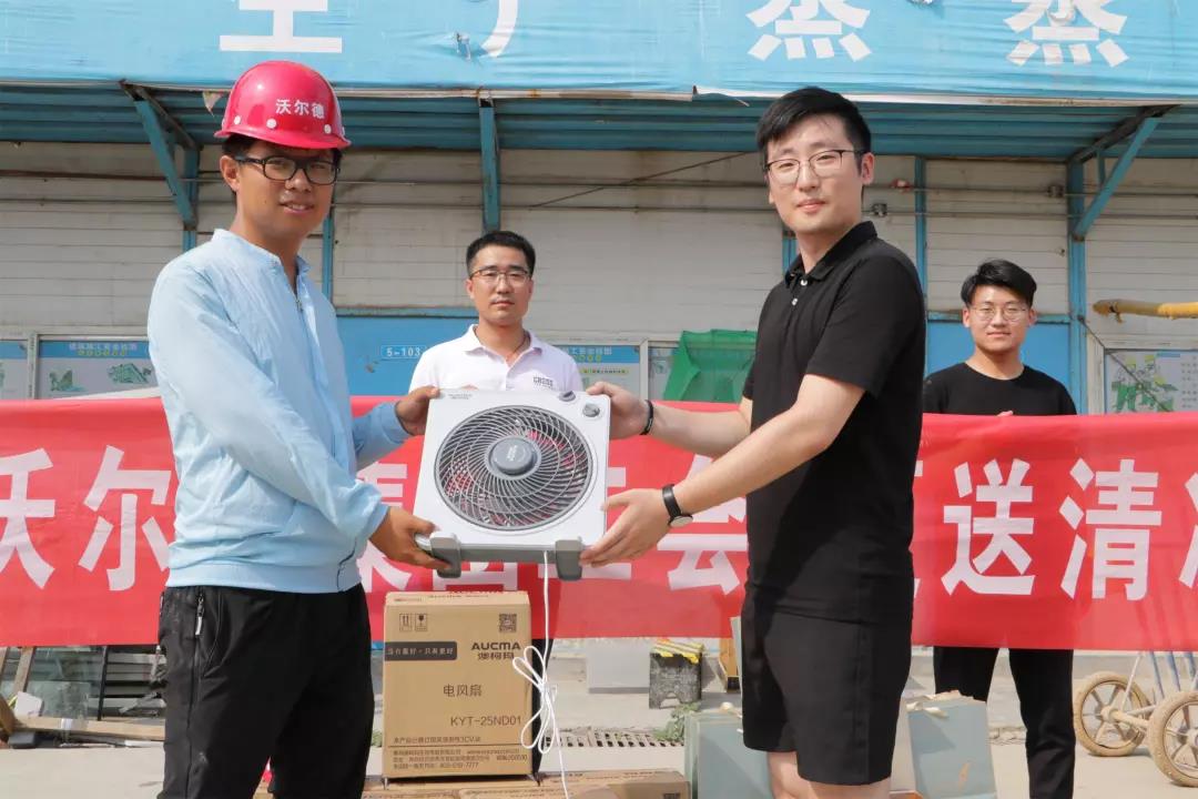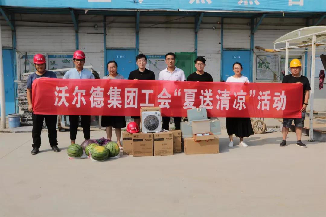 為做好防暑降溫工作,保障施工一線人員的健康權益,改善員工生產生活條件,2018年7月19日,沃爾德集團工會開展了“夏送清涼”活動。為奮戰在一線的員工們發放了電風扇、茶葉、西瓜等防暑降溫物品,把清涼送到了施工一線,把關懷送到大家心坎。
