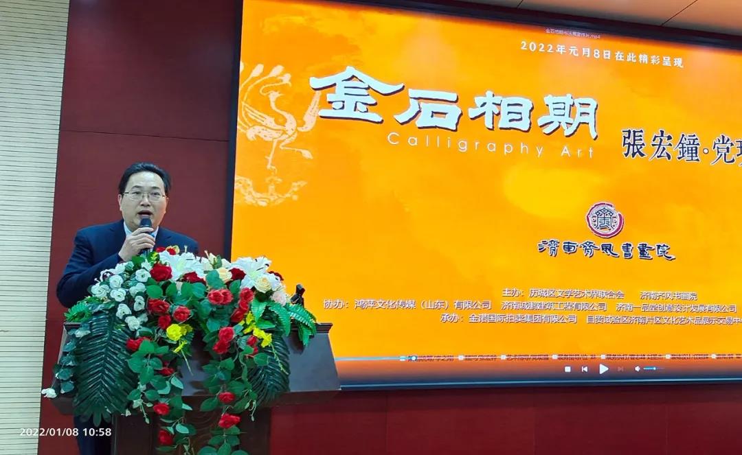 2022年1月8日上午,由濟南市歷城區文學藝術界聯合會、濟南齊風書畫院共同主辦,金諾國拍集團與自貿試驗區濟南片區文化藝術品展示交易中心承辦的“金石相期——張宏鐘、黨現強書法展”在自貿試驗區濟南片區文化藝術品展示交易中心拉開帷幕。