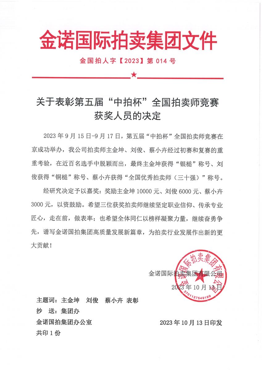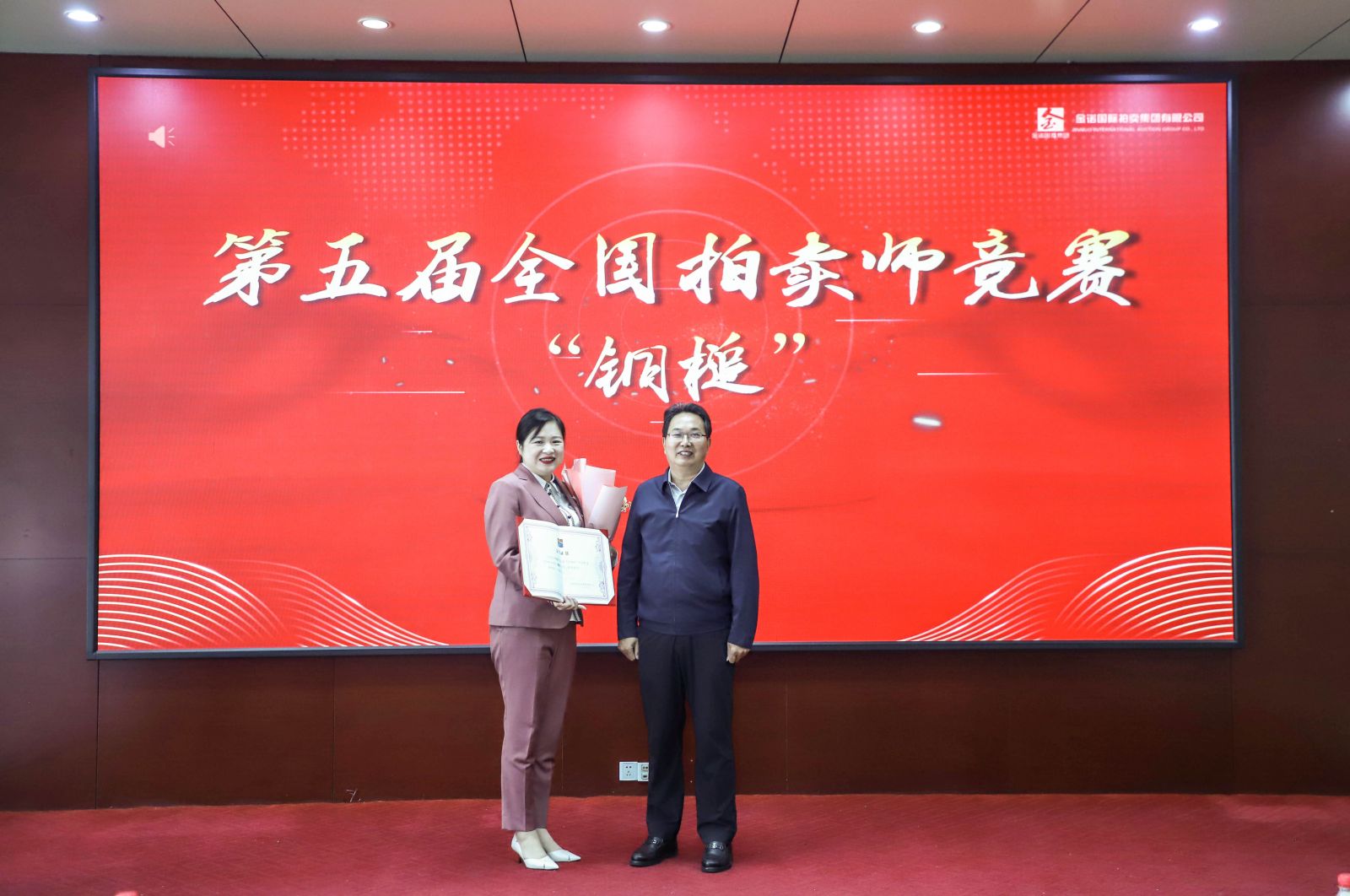 金諾國拍集團總裁位琳首先宣讀了《關(guān)于表彰第五屆“中拍杯”全國拍賣師競賽獲獎人員的決定》,“經(jīng)研究決定予以嘉獎,希望主金坤、劉俊、蔡小卉三位獲獎拍賣師繼續(xù)堅定職業(yè)信仰、傳承專業(yè)匠心,走在前,做表率;也希望全體同仁以榜樣凝聚力量,繼續(xù)奮勇爭先,譜寫金諾國拍集團高質(zhì)量發(fā)展新篇章,為拍賣行業(yè)發(fā)展作出新的更大貢獻!”