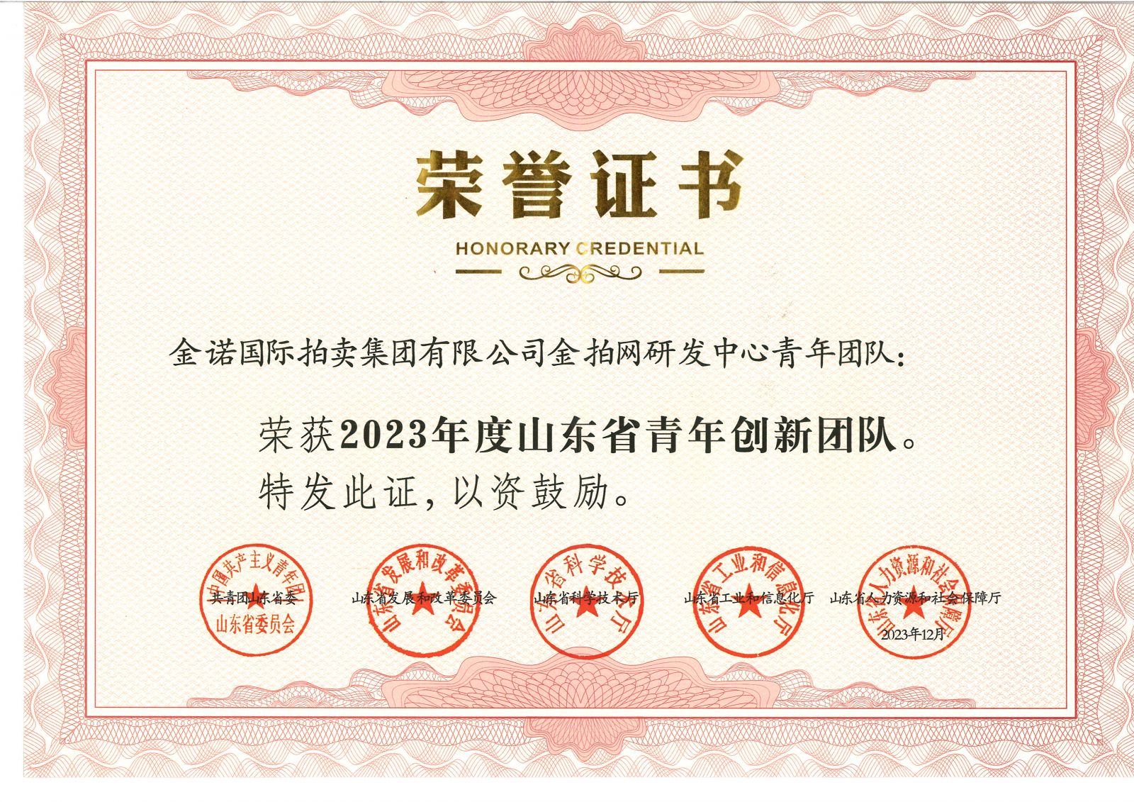 為全面貫徹落實黨的二十大精神,深刻領會習近平總書記關于青年工作的重要思想,在全省廣大青年中營造敢為人先、勇于創新的濃厚氛圍,團省委、省發改委、省科技廳、省工信廳、省人社廳聯合實施了“菁才強魯”行動。經廣泛推選和嚴格評審,“金諾國際拍賣集團有限公司金拍網研發中心青年團隊”脫穎而出,榮獲“2023年度山東省青年創新團隊”榮譽稱號。