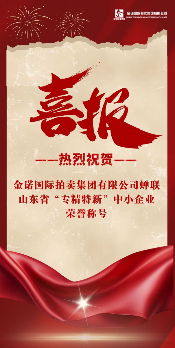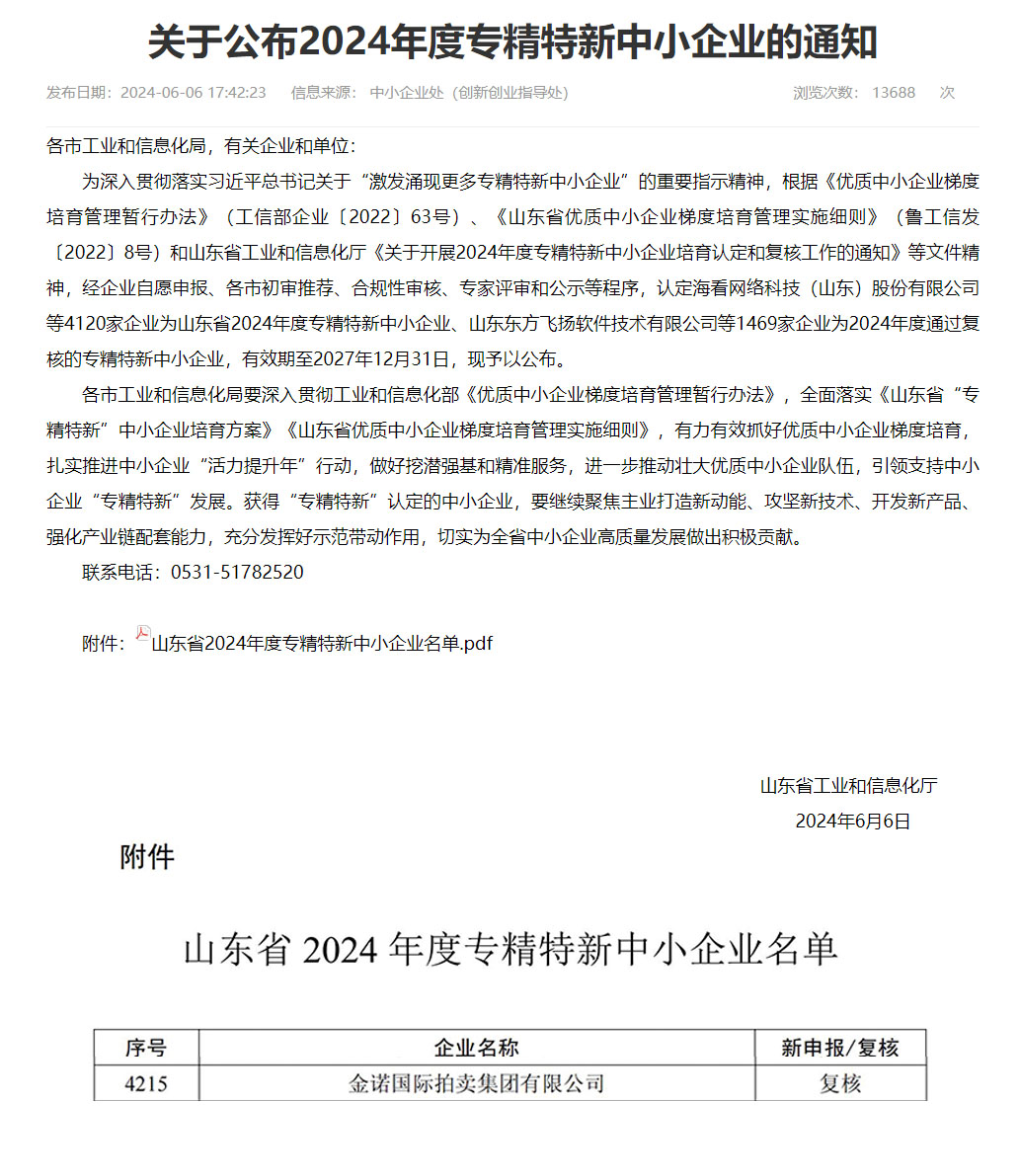 近日,山東省工業和信息化廳公布了“山東省2024年度專精特新中小企業名單”,金諾國際拍賣集團有限公司順利通過初審推薦、合規性審查和專家評審等程序,蟬聯山東省“專精特新”中小企業榮譽稱號。